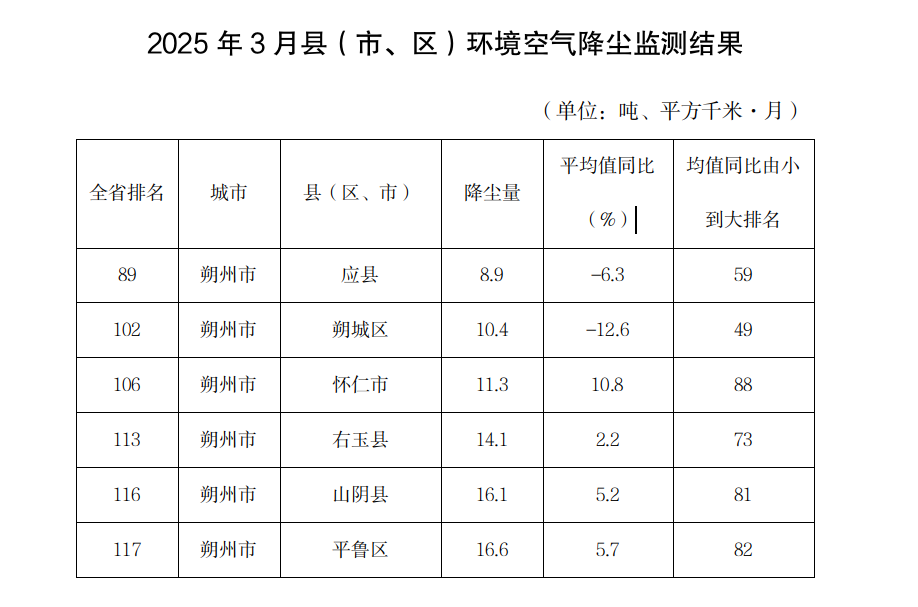 依据山西省生态环境厅《关于2025年3月全省环境空气降尘监测结果的通报》,现将我市各县(市、区)2025年3月降尘结果进行公示。
