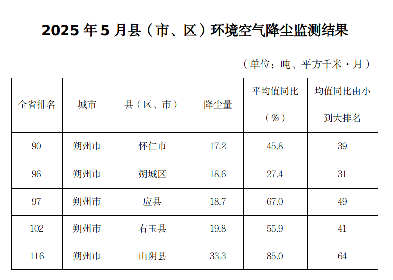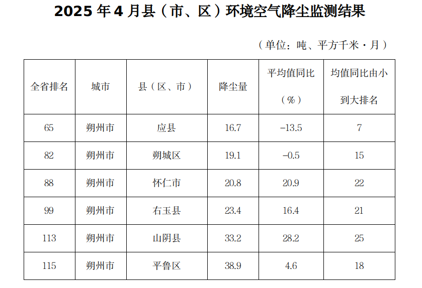2025年4、5月朔州市各县(市、区)环境空气降尘监测结果公示